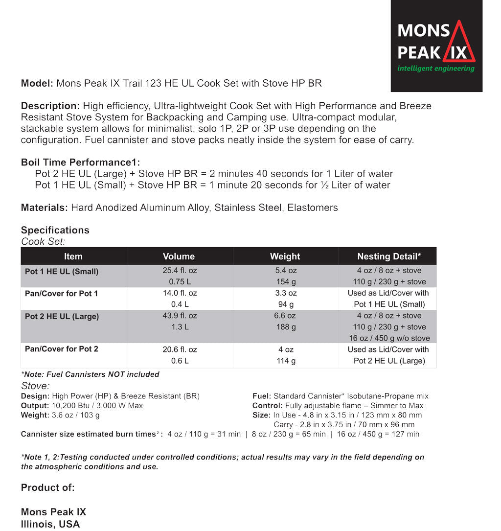 Mons Peak IX Trail 123 HE UL Cook Set with Stove